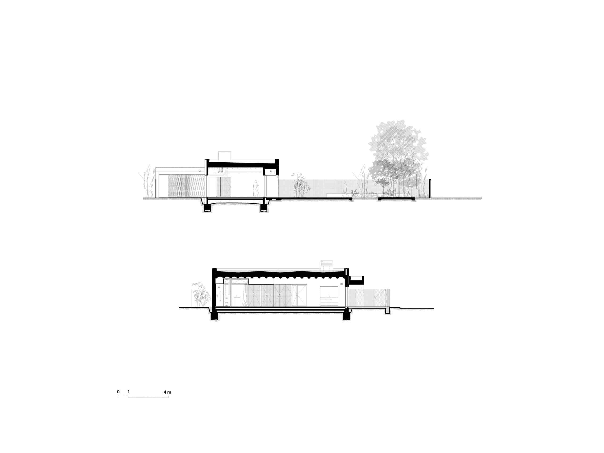 El proyecto resuelve la casa en planta baja. La implantación en la parcela consigue dos cosas: diferenciar dos zonas en el jardín y orientar todas las estancias a sur para aprovechar al máximo el sol. Todo el cerramiento de la vivienda a sur es acristalado y, con la concurrencia del porche, permite a la vivienda aprovechar al máximo las ganancias solares en invierno y evitar el calentamiento en verano para reducir el consumo energético.